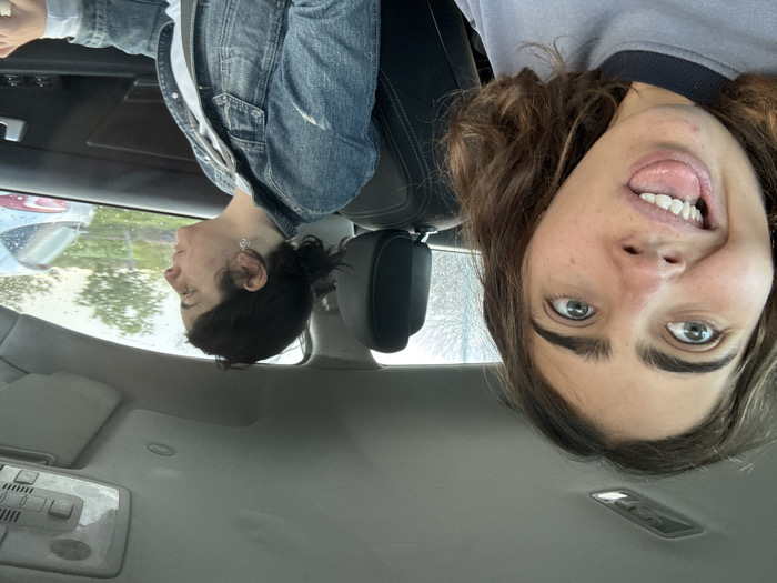Two females are depicted inside a vehicle in the city of Nes Ziona, Israel. The individual in the front passenger seat, a young female with brown hair and light eyes, is positioned in the foreground, facing the camera with a playful expression: eyes widened and tongue slightly extended. She wears a grey sweatshirt. In the driver's seat, an adult female with dark hair pulled back, wearing a denim jacket over a white top, is visible in profile, looking forward. Her right hand rests on what appears to be the steering wheel or armrest. Raindrops are visible on the side window, and the exterior environment is blurred, showing green foliage and a partial view of another light-colored vehicle in the background. The car's interior features a grey headliner and dark seating.