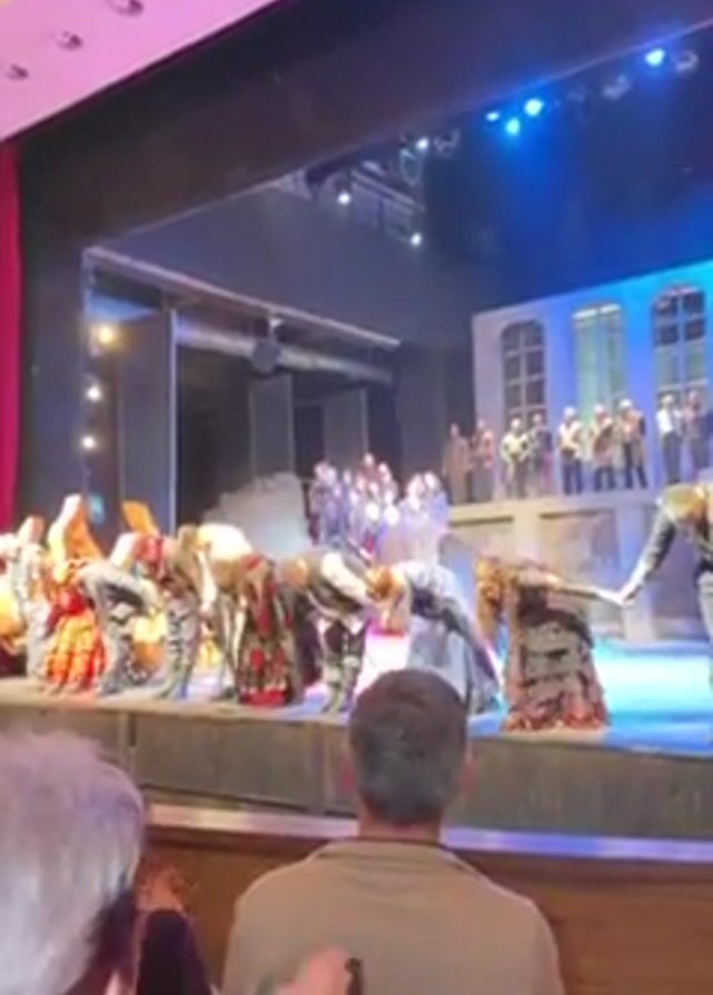 stage production receiving applause from the audience. The performers, dressed in historical or folk costumes, are taking bows. The stage is decorated to resemble a town square or courtyard, with painted backdrops of buildings. Stage lighting includes blue and white spotlights. The audience is visible in the foreground, applauding. The theater's ceiling is illuminated with pink and white light.