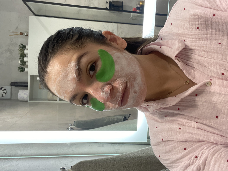 A female subject is depicted in a close-up portrait, from the upper torso upwards, positioned within what appears to be a modern bathroom. She has dark hair pulled back and wears a light pink button-up shirt adorned with small red heart patterns. A delicate gold-colored necklace with a small pendant is visible around her neck. Her face is covered with a white, creamy facial mask application, and green, translucent hydrogel patches are applied beneath each eye. She is looking directly forward. The background features light grey, possibly concrete-effect, tiled walls. To the left, a chrome towel rail holds a grey towel, and a vertical illuminated light strip or mirror edge is present. To the upper right, a white wall-mounted shelving unit displays a ventilation fan, a roll of patterned toilet paper, a black spray bottle, several small artificial potted plants, and a reed diffuser. A black-framed mirror is partially visible to the right of the shelving, and below it, a black pump dispenser bottle and other small containers rest on a surface. The specific location within Sofia, Bulgaria, cannot be determined from the visual evidence.