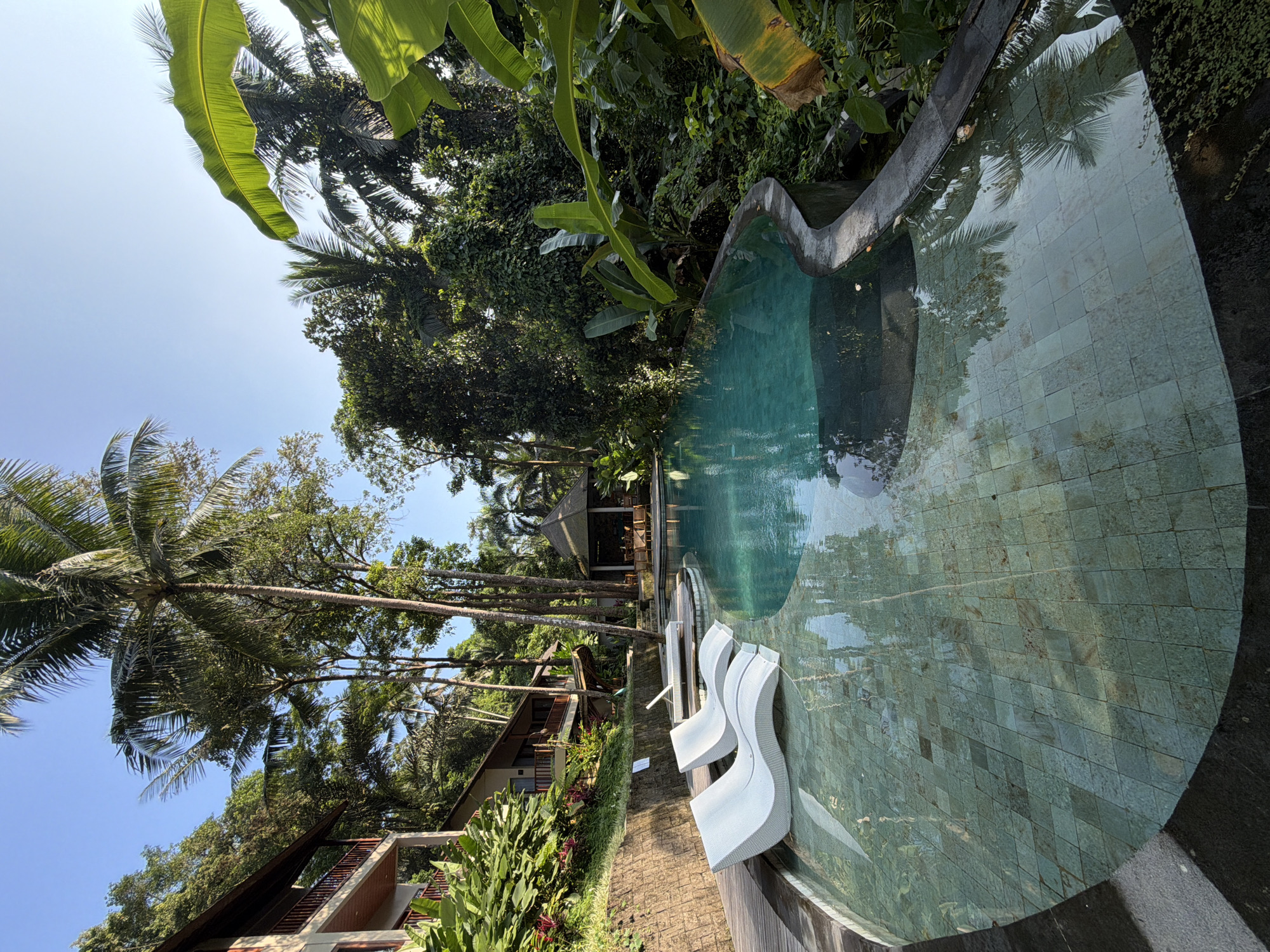 swimming pool area at a resort in Kedewatan, Indonesia. The pool is uniquely shaped, with a stone tile perimeter and green-tinted water reflecting the surrounding foliage. Two white, modern lounge chairs are positioned on a wooden deck adjacent to the pool. Beyond the pool, tropical vegetation is lush, including palm trees and banana plants. Several buildings are visible in the background among the trees, appearing to be part of the resort. The sky is blue and mostly clear.