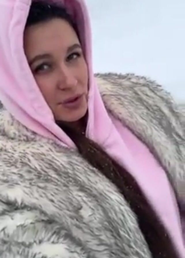A woman wearing a pink hoodie and a faux fur coat is standing in a snowy environment, possibly in a rural or suburban area