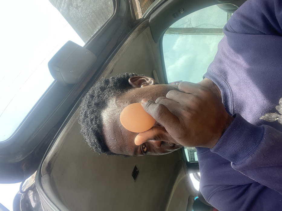 An adult male subject with dark skin and short, dark, curly hair is observed from a frontal perspective, situated within a vehicle interior. He is wearing a dark blue long-sleeved sweatshirt with a faint lighter pattern on the lower front. His left hand holds a single light brown egg directly over his left eye, obscuring it. His right eye is visible and looks towards the viewer. The vehicle interior includes a light-colored, worn headliner. An open section of the vehicle's roof or hatch is visible above, revealing a bright, possibly overcast, sky. A small, box-shaped fixture is mounted on the vehicle's ceiling. To the right, a tinted side window provides a partial view of an outdoor environment, displaying a vertical pole and what appears to be mesh or netting. Lighting is consistent with daylight. The scene occurs in the city of Epe, Nigeria.