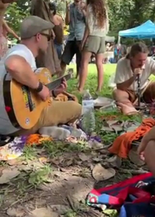 group of people gathered outdoors, with some standing and others sitting on the ground. Two men are performing music: one playing an acoustic guitar and the other singing into a microphone. There are colorful cloths and a water bottle scattered on the ground around them. People are talking, dancing, and interacting in the background. The setting appears to be a park or wooded area, with trees visible behind the group. A blue tent is visible in the distance.