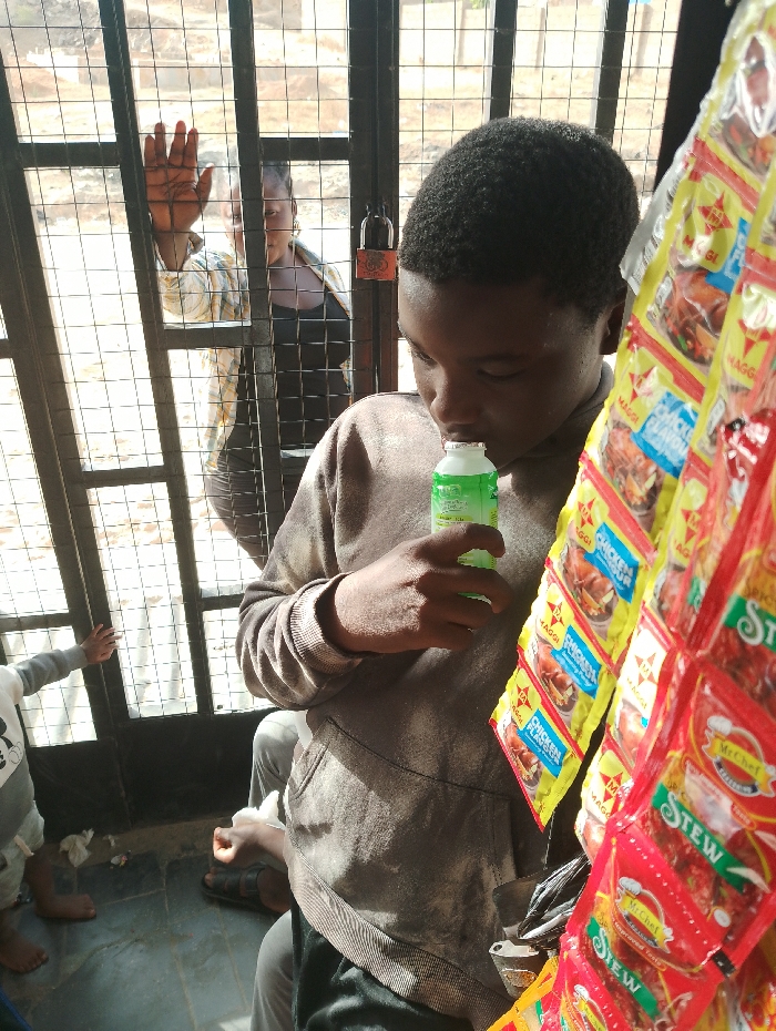 An image captured in Nyanya, Nigeria, depicts an indoor-outdoor scene through a metal security gate. In the foreground, a dark-skinned individual, likely a young male with short, dark, curly hair and wearing a grey hooded sweatshirt, holds a small, light-green bottle with a white cap to his mouth, appearing to drink or smell its contents. To his immediate right, a vertical display of packaged goods hangs; visible are yellow sachets labeled "MAGGI CHICKEN FLAVOUR" and red sachets labeled "Mr. Chef STEW." Behind the main subject and the display, a dark metal grid gate, secured by a black padlock, separates the foreground area from the background. Behind this gate, a dark-skinned female, wearing a light-colored patterned long-sleeved shirt over a dark top, stands with her right hand pressed flat against the gate bars, palm outward. To her left, partially visible, a barefoot child with light-colored clothing stands on a grey tiled floor, with crumpled white paper fragments scattered nearby. The outdoor background beyond the gate is blurred, showing distant ground or structures under bright illumination.