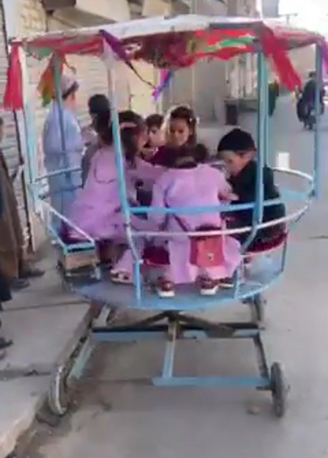 - "On a sunny outdoor day, a group of about six children is riding on a small, homemade, makeshift roundabout" by FM-7ELnX2, licensed under CC BY 4.0