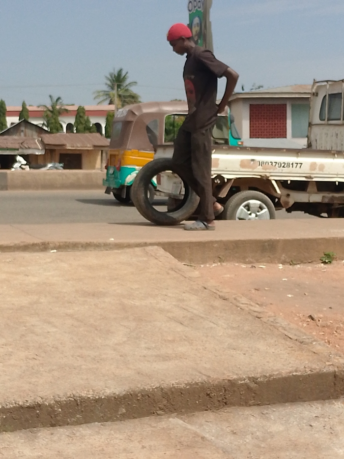 - "This image depicts a daytime street scene in Jos, Nigeria, showing a young male interacting with a tire by a roadside" by FM-KVotS2, licensed under CC BY 4.0