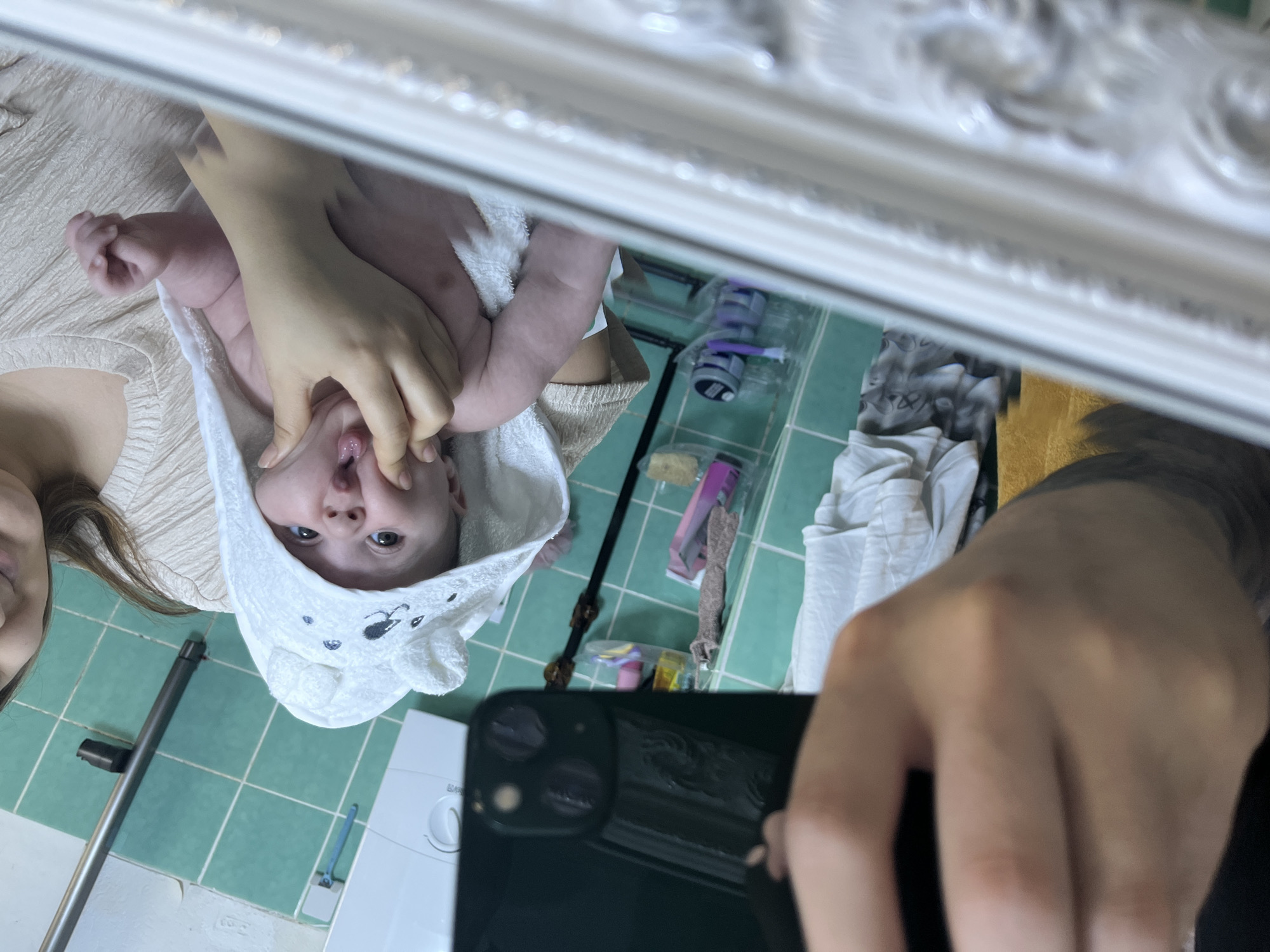 A mirror selfie captures an adult and a baby in a bathroom in Offenbach am Main, Germany