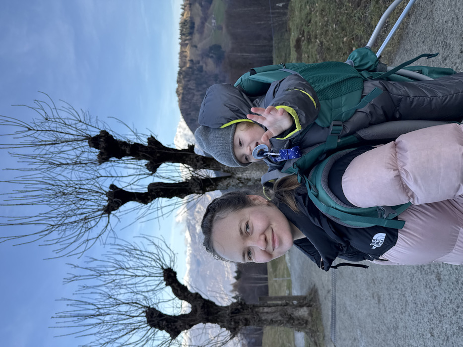 The image captures an adult female carrying a child in a backpack carrier on a path in Bellagio, Italy. The female, positioned on the left, has light brown hair pulled back and wears a black and pink puffer jacket. She smiles towards the viewer. On her back, a toddler in a grey knit beanie and a grey and neon-yellow winter jacket is seated within a dark green child carrier. The child extends a gloved hand in a waving gesture; a blue pacifier attached to a clip is visible near the child's chest. In the mid-ground, three large, leafless pollarded trees with thick, gnarled trunks are prominent. Beyond them, snow-capped mountains are visible against a clear blue sky. Rolling hills with sparse vegetation occupy the right mid-ground. A light-colored, possibly gravel or dirt path is visible in the foreground.