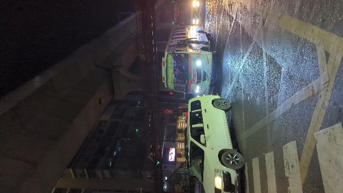 The image depicts a nighttime urban street scene in Dhaka, Bangladesh, characterized by wet asphalt roads and an overhead elevated concrete structure, likely a metro rail viaduct or flyover