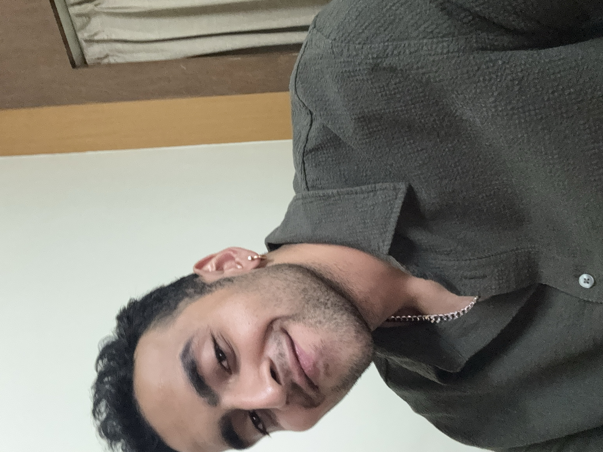 A male subject, appearing to be in his 20s to early 30s, is captured in a close-up, chest-up portrait shot. He has dark, curly hair, defined eyebrows, and short facial stubble. His right ear features a small, gold-colored hoop earring. A silver-colored chain necklace is visible around his neck, partially obscured by his shirt collar. He is wearing a dark grey or greenish button-up shirt with a textured fabric, possibly a linen or herringbone weave. The subject is looking directly towards the camera with a slight smile, showing a natural facial expression. The background consists of a plain light cream-colored wall to the left and center. To the right, a vertical section of a light brown panel or wall meets a darker brown vertical surface. Further right, a light beige or off-white curtain is visible, suggesting a window or doorway. The interior setting provides no specific visual cues to identify a precise location within Kolkata, India.