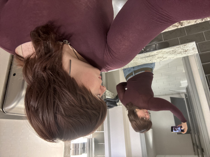 A person in a burgundy long-sleeved shirt and jeans takes a mirror selfie in a bathroom. The bathroom features grey subway tiles, a granite countertop, and a stainless steel sink. The reflection shows the person holding a phone, capturing their outfit and hairstyle. The angle of the image is slightly tilted.