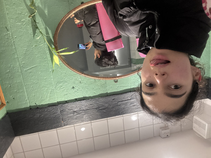 A person in a black jacket stands in front of a white tiled wall. The person's tongue is slightly sticking out. A mirror behind the person reflects the person holding a phone, capturing their reflection, and a pink yoga mat rests on their shoulder. A green wall with a plant is visible next to the mirror. A dark gray beam runs along the top of the tiled wall. A white ventilation grille and a small electrical outlet are on the wall.