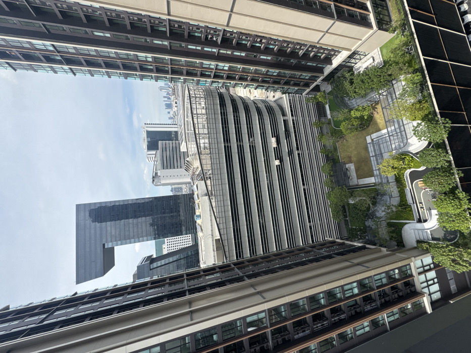 An aerial view showcases a modern cityscape with tall buildings. One building features a unique "L" shape. A structure with vertical stripes stands prominently near a rooftop garden with trees and walkways. The sky is partly cloudy. The shot is taken from a high vantage point, possibly from within another tall building.