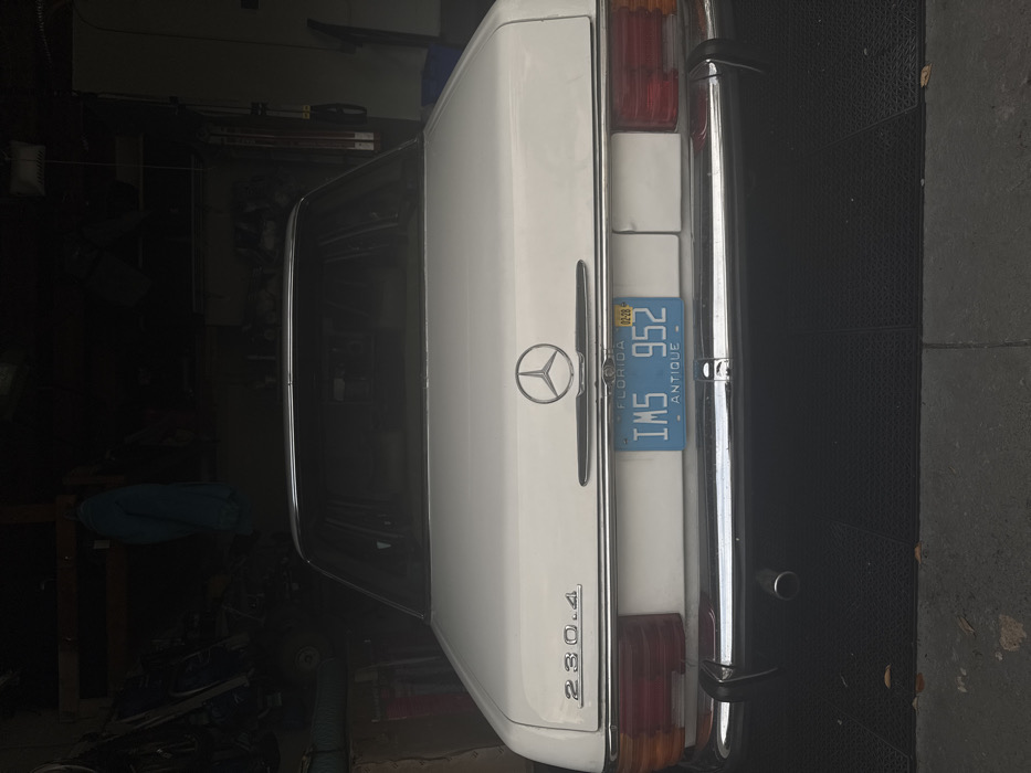 A white Mercedes-Benz 230.4 antique sedan, displaying Florida license plate "IMS 952" with an expiration of "02-28," is parked facing away from the viewer inside a dimly lit garage in Miami Shores, United States of America. The vehicle's rear features a chrome bumper, a centered Mercedes-Benz emblem, and red and amber taillight assemblies. A single exhaust pipe is visible on the lower left. The garage floor consists of dark, possibly rubberized mats over a concrete surface in the foreground. The background reveals a cluttered storage area with various tools, equipment, and a blue garment hanging on a rack or wall, characteristic of a residential garage environment. No individuals are present in the scene.