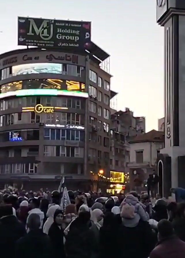 large crowd of people gathered in a city square. There are several buildings visible, including one with a sign for "MJ Holding Group" and another with a sign for "Jood Elevators." There is also a clock tower. The crowd appears to be mostly composed of people of Middle Eastern descent. Some are wearing headscarves. Some people are carrying flags, and there appears to be a food vendor present.