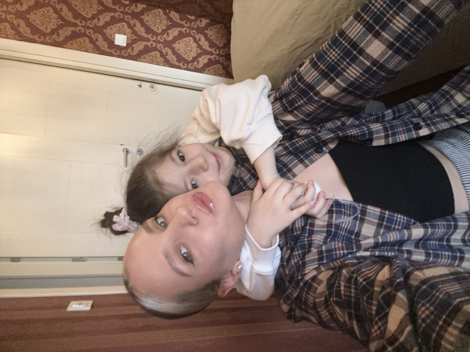 A woman and child lie together. The woman wears a plaid shirt over a black top, while the child wears a light-colored long-sleeved shirt. The child's hands rest on the woman's chest. The background includes a patterned wall and part of a bed or sofa. The photo is taken from a slightly overhead angle, tilted to the side. Both the woman and the child are looking at the camera.