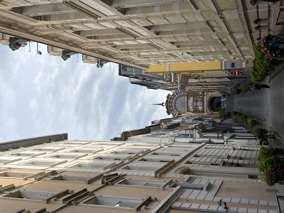 The image depicts a steep, ascending urban street in Évian-les-Bains, France, under an overcast sky. The street, identified as Rue Nationale, is flanked by multi-story buildings and leads directly uphill towards the distinctive Palais Lumière. **Location:** Rue Nationale, Évian-les-Bains, France, looking uphill towards the Palais Lumière. **Environment:** The paved asphalt road ascends centrally, bordered on both sides by sidewalks and rows of green potted plants, some displaying pink flowers on the right. Street signs include a red circular 'no entry' sign with a white bar and a blue square sign beneath it, both visible on the right sidewalk. A streetlamp is also present on the right. **Buildings:** * **Left side:** Buildings are predominantly light beige, cream, and pale peach in color, featuring multiple stories (at least five visible). They have numerous rectangular windows, some with white shutters, and decorative cornices. A black security camera is mounted on a lower building facade. * **Right side:** Buildings are light yellow-beige brick or painted stone, also multi-story, with distinctive arched window designs and decorative corbels/sculptures near the roofline. A segment of a yellow building with a balcony is visible further up the incline. * **Focal Point (Palais Lumière):** At the top of the street, the ornate facade of the Palais Lumière dominates the view. It features a large, semicircular arched glass structure at its upper level, revealing internal dark elements. A prominent spire with a finial crowns the building. A dark archway entrance is visible at ground level, accessed by steps or a ramp. **People:** One individual is visible on the right side of the street, roughly mid-distance, standing with their back partially turned towards the camera, facing left. The person is dressed in dark clothing, possibly a jacket and pants. **Actions/Interactions:** The individual appears to be standing or walking slowly on the sidewalk. No direct interaction with other subjects or objects is discernible. The street itself is clear of vehicles.