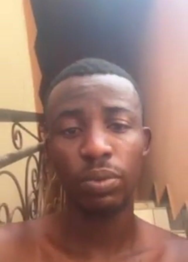 close-up shot of a dark-skinned man with short, dark hair and a short beard. He is shirtless and looking directly at the camera. The background includes a light-colored wall, a metal railing with a decorative design, and stairs. The lighting is bright.