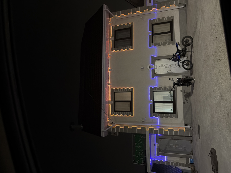 This image depicts the exterior of a two-story residential building at night in Voronezh, Russia. The building features a light-colored, possibly cream or off-white, facade with a dark brown pitched roof. A metallic chimney is visible on the upper left side of the roof. White gutters are present along the roofline. The building's exterior is extensively illuminated by LED strip lighting. Orange-yellow lights outline the two upper-story rectangular windows and run vertically along the corners of the main building section. Blue lights outline the two lower-story rectangular windows and the main central entrance door, extending horizontally across the lower facade. This blue lighting also delineates a single-story extension on the left side, which includes a secondary door with a grey ornate design. The main entrance door is lighter in color, possibly white or light grey, and features an elaborate, curvilinear embossed design. All windows have dark frames, and a white curtain is visible behind the lower-left window. Decorative, possibly stone-like, trim with a textured appearance frames all windows and the vertical edges of the building. A green and white decorative panel, possibly floral, is mounted above the left single-story extension. The ground in front of the building is a flat, grey, paved surface. Two motorcycles are parked on this surface. The motorcycle on the left is dark-colored and appears to be a standard model. The motorcycle on the right is a blue and black dirt bike or motocross bike, distinguished by knobby tires and a high front fender, resting on a kickstand. Shadows of the motorcycles are cast on the ground directly beneath them due to ambient lighting. The sky is dark and featureless, indicative of nighttime conditions. No individuals are visible, and no actions or interactions are occurring. A dark, indeterminate object lies on the ground in the lower-left foreground. Horizontal dark lines, possibly power lines, are faintly visible against the dark sky at the very top of the image.