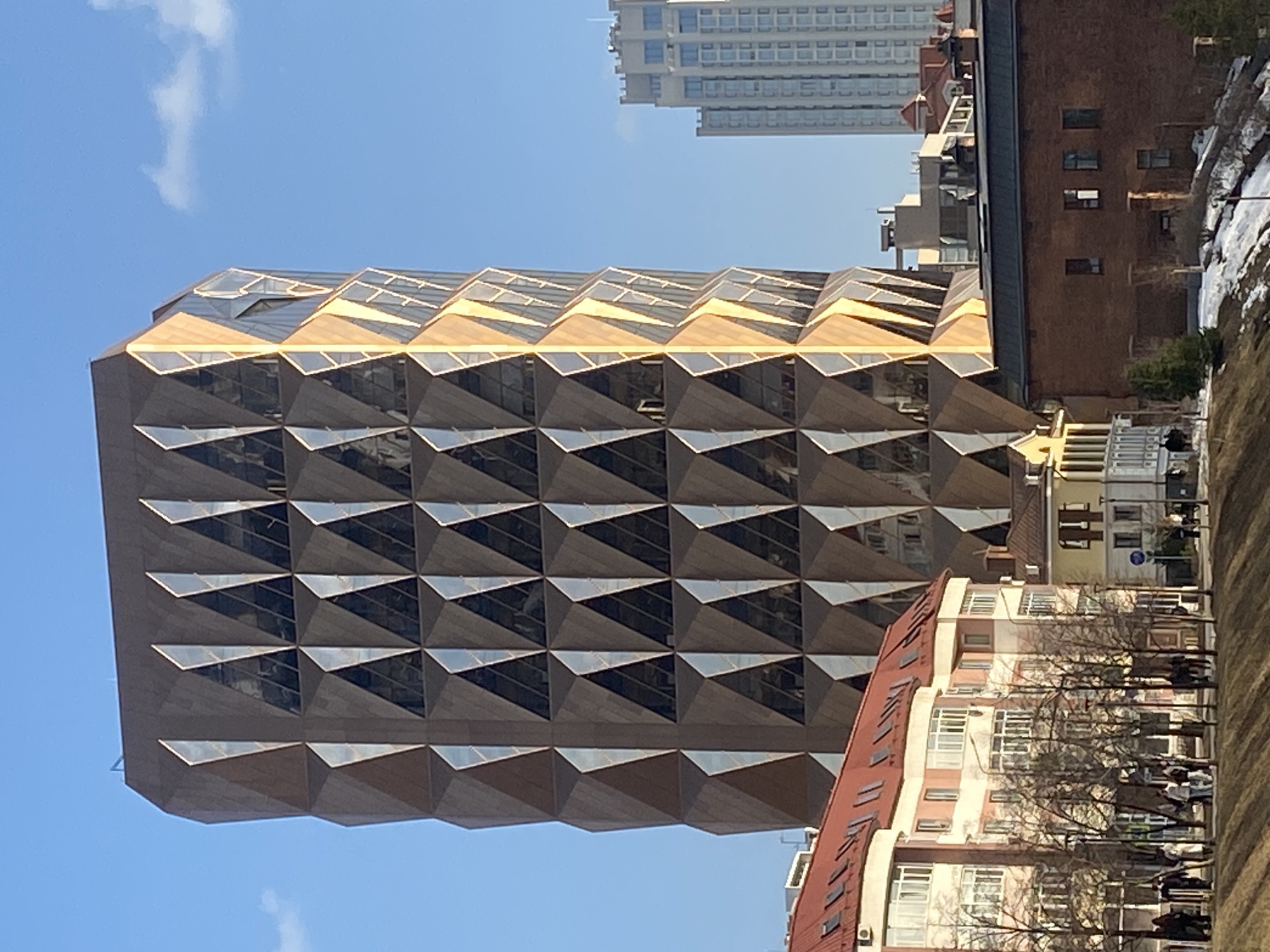 The image displays an urban scene in Yekaterinburg, Russia, dominated by the Boris Yeltsin Presidential Center. This is a tall, rectangular, multi-story building with a distinctive dark bronze or brown facade composed of a repeating pattern of triangular, faceted panels, each containing a recessed, reflective triangular window. The right side of the building is illuminated by direct sunlight, casting a golden hue on its surface. In the foreground, to the left, a row of multi-story residential buildings with light-colored (cream and pink) facades and prominent red sloped roofs featuring dormer windows are visible. A paved pedestrian area in front of these buildings is populated by approximately 15-20 individuals, dressed in casual attire, either walking or standing. Numerous bare deciduous trees line this pedestrian area, accompanied by streetlights. To the immediate right of the foreground residential buildings, a low, older-style brick building with several windows is present. Further in the background, to the right of the Yeltsin Centre, a tall, light-colored skyscraper with a grid of rectangular windows and a distinctive castellated roofline stands against the sky. The foreground ground cover consists of a sloped embankment with patches of brown earth and residual snow, suggesting a late winter or early spring season. The sky is clear blue with sparse white clouds.