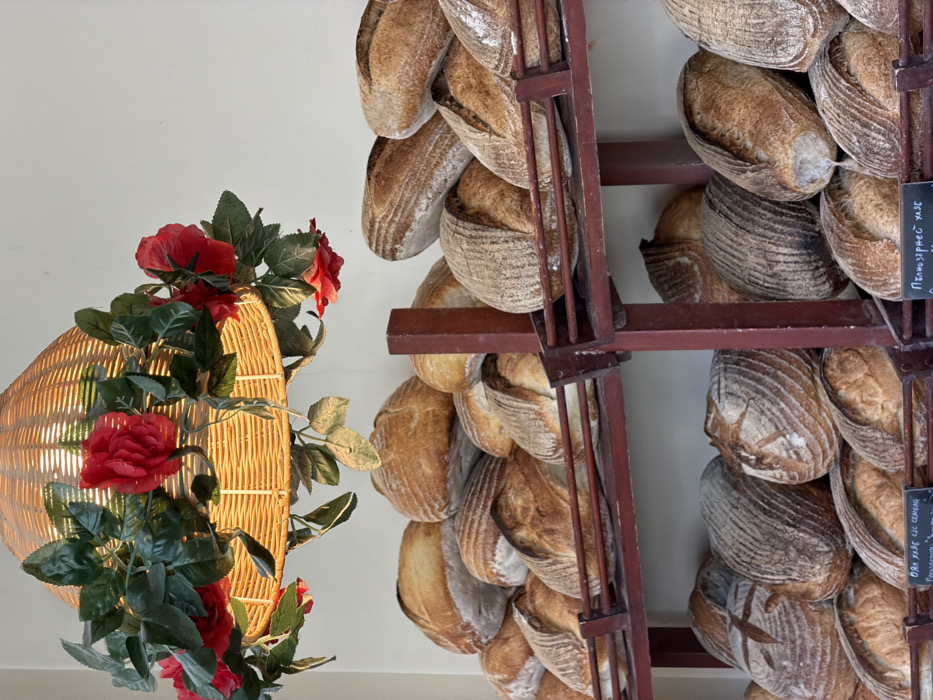 - "The image depicts a detailed view inside a bakery or bread shop, focusing on a display of bread loaves and an overhead light fixture" by FM-0qQUs1, licensed under CC BY 4.0