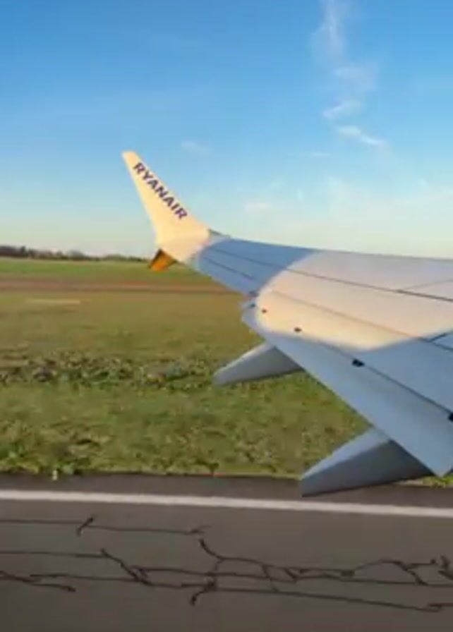 - "Ryanair airplane wing during takeoff, with a clear blue sky above and a green and brown field passing by below" by FM-9gGO02, licensed under CC BY 4.0