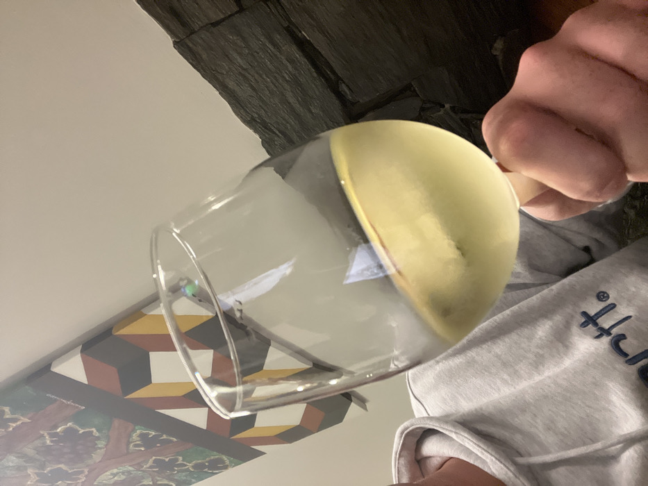 A person holds a glass with a gold liquid inside. The glass is transparent with a thick rim. The liquid is opaque and fills about a third of the glass. The person's hand and part of their gray hooded sweatshirt are visible. Behind the glass, there's a wall with a painting featuring geometric shapes and trees. To the upper left, there's dark gray textured material.