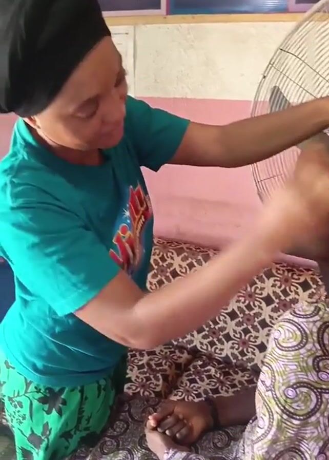 woman wearing a black headscarf, green t-shirt, and floral green pants adjusting the headscarf of a woman who is sitting on a couch with a patterned cover. The woman on the couch is wearing a patterned dress. A large fan is visible in the background. There are posters on the wall behind the couch. The woman adjusting the headscarf smiles as she finishes. The woman on the couch also smiles.