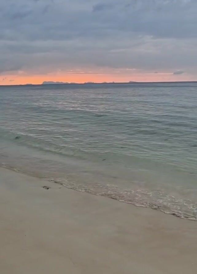 tranquil beach scene at dusk or dawn. The sky above is covered with dark, heavy clouds, but there's a distinct orange glow along the horizon where the sun is setting or about to rise. The water appears calm with gentle waves lapping at the shore. The sand on the beach is light-colored. Distant landmasses can be seen on the horizon, silhouetted against the bright horizon glow. The scene is peaceful, with the focus on the natural elements of the sea, sky, and beach.