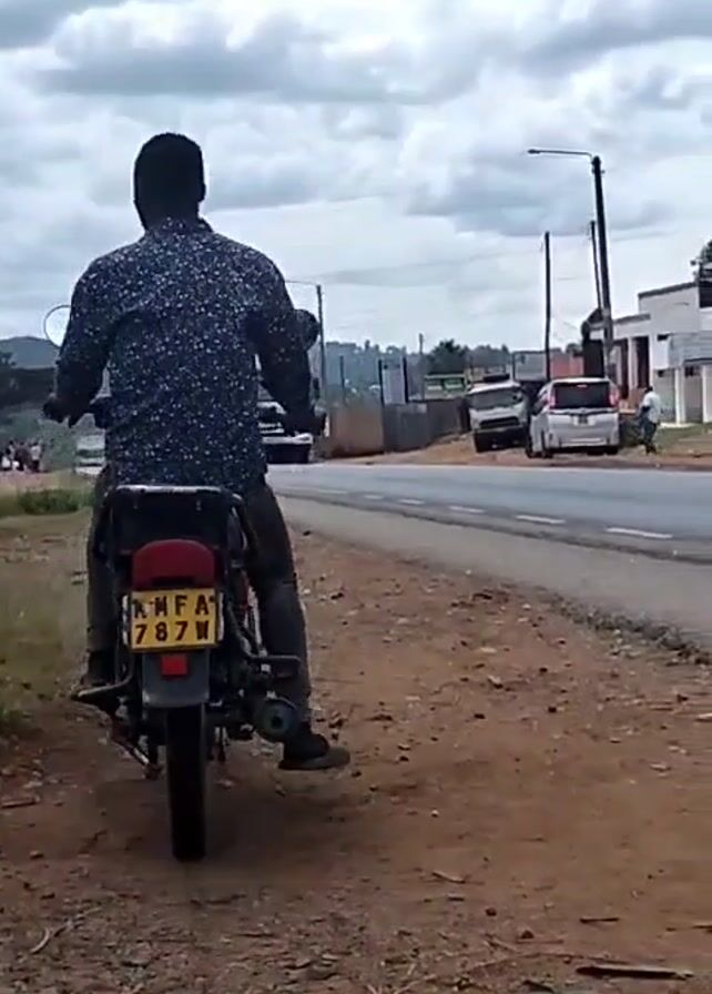 man on a motorbike preparing to enter a road. He is seen from behind, wearing a patterned shirt and grey pants. The motorbike's license plate reads "KMFA 787W". The road has traffic including cars and a large white truck. The setting appears to be a street in a town with buildings on either side of the road and a dirt shoulder where the motorbike is positioned. The sky is overcast.