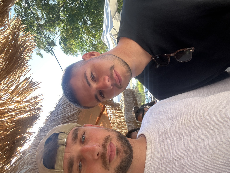 The image depicts two young adult males in an outdoor setting within Kfar Ruth, Israel