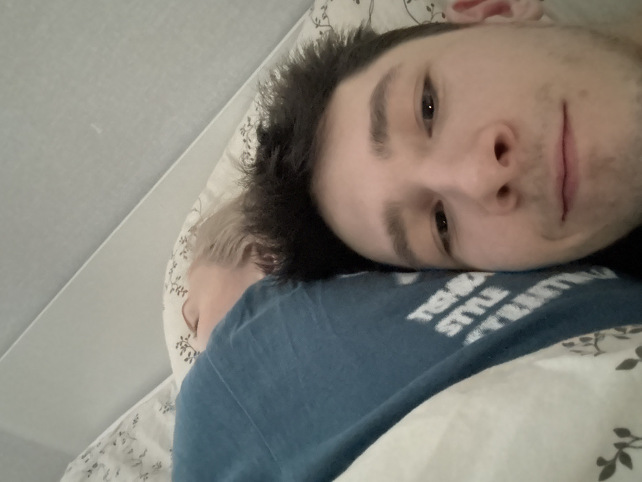 The image displays two individuals in a bedroom setting in Yanino-1, Russia. In the immediate foreground, positioned on the right, a male individual with dark, short hair, light skin, and visible stubble is depicted from the chest up, looking directly at the camera with a subtle smile, indicative of a self-portrait. To his left, partially obscured by his head, lies a second individual with light blonde hair, appearing to be asleep. This individual's head rests on a white pillow adorned with a faint dark leaf pattern, and a blue fabric, possibly a garment with partially legible white text "TEE STYLE", covers their upper body. Both individuals are situated on white bedding featuring a similar subtle pattern. The background consists of a plain, light-colored wall or headboard, exhibiting a diagonal seam or structural line.