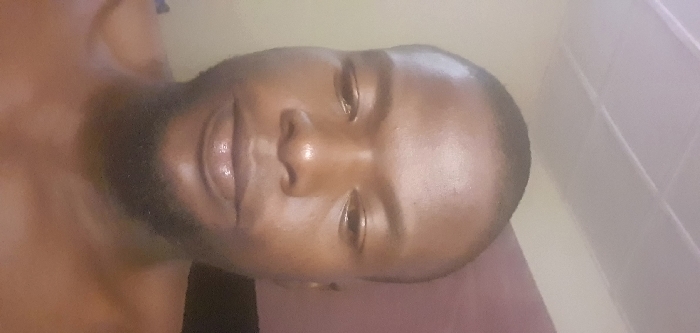 A close-up portrait shows a dark-skinned man with a shaved head and a full, dark beard. His face is slightly angled to the side, with his eyes open and a relaxed expression. The background is a blurred mix of white and light pink, suggesting a wall or other interior surface. The lighting is soft, highlighting the texture of his skin. The image is rotated, positioning the man's head on its side.