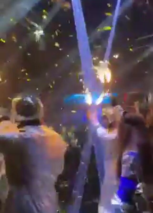 crowded event, possibly a party or celebration, with several people wearing shiny, reflective outfits. Confetti falls from above, and there are bursts of flames or sparklers being held up by some individuals. The lighting is dynamic, with blue spotlights and various other lights flashing around the room. It looks like a festive and energetic atmosphere with music and possibly dancing.