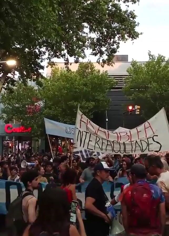 crowd of people participating in a protest or demonstration. The event is taking place on a city street lined with trees and buildings, with a "Costco" store visible in the background. The crowd is carrying a large banner that reads "ASAMBLEA INTERFACULTADES" in red letters. Several Argentine flags are also visible. People in the crowd are carrying backpacks and holding cell phones, seemingly documenting the event. Some are speaking into megaphones. The overall atmosphere suggests a political or social movement of some kind. Traffic lights are visible in the background, indicating the presence of vehicles nearby.