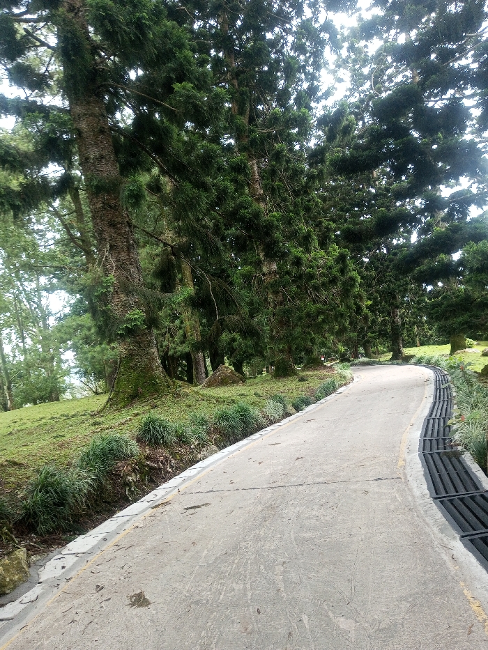 The image depicts a paved, light gray pathway curving through a densely forested area in Padegaon, India. Large, dark green evergreen trees with thick, textured trunks line both sides of the path, creating a canopy overhead that allows diffuse, bright light to filter through. The ground adjacent to the path on the left is a grassy embankment covered in green turf and clumps of dark green ground cover. Moss or epiphytic growth is visible on some tree trunks. On the right side of the pathway, a drainage ditch with dark metal grates runs parallel to the curve. No people, subjects, or active interactions are present in the scene.