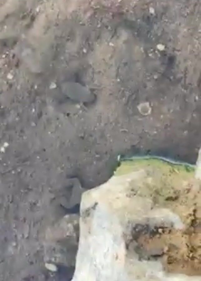 shallow body of water with a muddy bottom, containing a few rocks. At least two frogs are visible in the water, one of which is moving around. A turtle can be seen partially visible on the edge of the water.