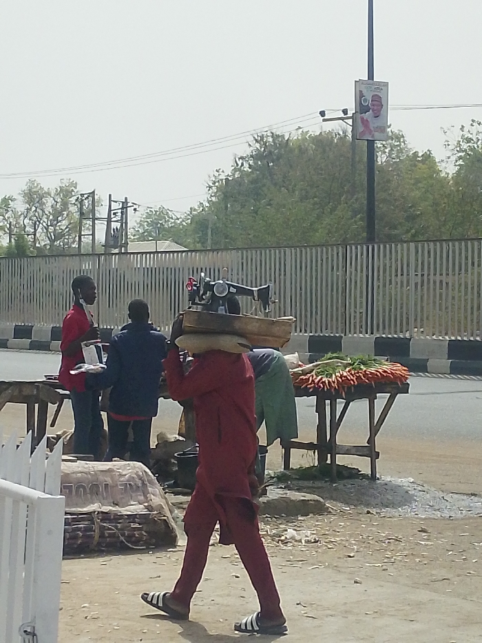 This image depicts a daytime street scene in Dorayi, Nigeria. In the foreground, a person wearing a red tunic and matching trousers, with black and white striped slides, walks from right to left while carrying a black sewing machine mounted on a wooden frame balanced on their head. To the left, two individuals stand near a wooden table; one in a red shirt faces left, while another in a dark blue jacket faces right, partially obscured. A third individual, wearing green attire, is partially visible behind a second wooden table laden with a large pile of orange carrots with green tops, situated to the right. Bundles wrapped in white material, labeled "TOOL," rest on the dusty ground in the immediate foreground. In the mid-ground, a white vertical slat fence separates the vendors from a paved road featuring a black and white striped curb. Further in the background, a tall black pole supports electrical wires and displays a vertical banner featuring a man in traditional attire. Dense green foliage and lighter-colored trees are visible behind the pole and fence. The sky is bright and hazy.