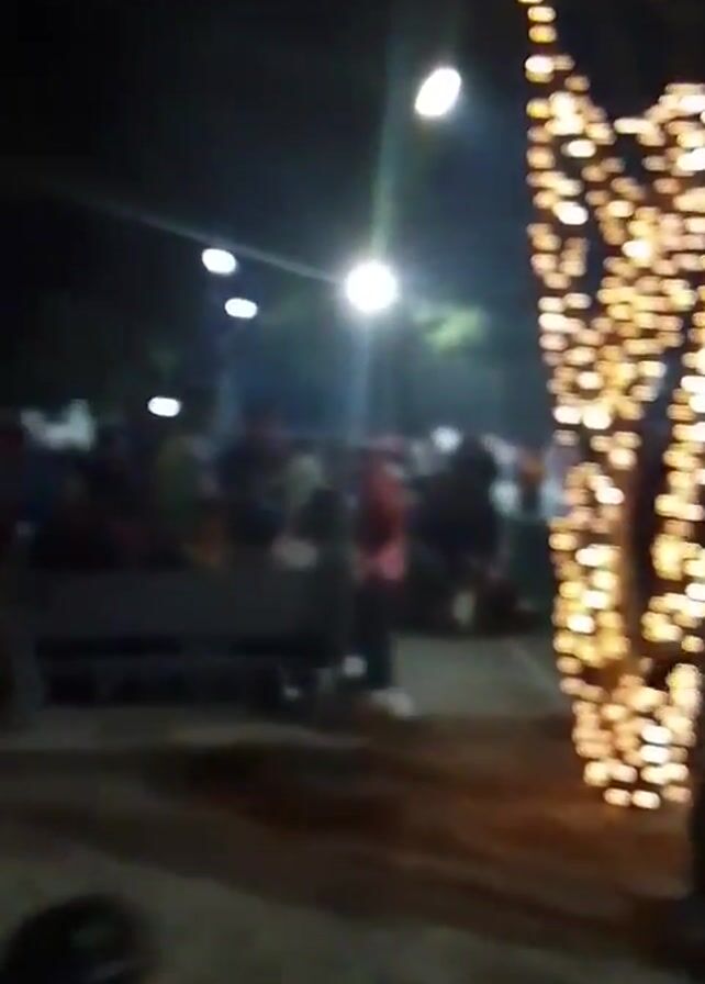 At night, a blurry video depicts a crowded outdoor gathering. Trees are adorned with strings of white lights, creating a festive atmosphere. People are milling around, some standing in groups, others walking. The camera moves slightly, showing more of the crowd and the lighted trees. There's also a glimpse of a red object with lights. The scene seems to be a public space, perhaps a park or plaza, decorated for an event.