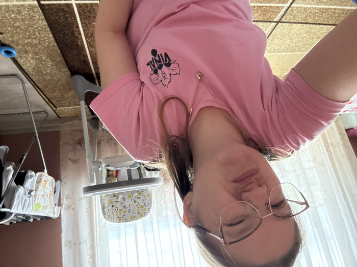 A female subject is depicted in a close-up selfie within a residential interior in Sofia, Bulgaria. She has light brown hair, wears cat-eye glasses, and a pink short-sleeved t-shirt featuring a black grape and leaf graphic with the word "VINAL" on the left chest. A thin necklace with a small pendant is visible around her neck. Her facial expression includes squinted eyes and pursed lips, with a small white particle visible on her lower lip. The background reveals a brightly lit window with white patterned curtains, a white and grey baby high chair with a patterned seat and a toy on its tray, and a silver clothes drying rack laden with laundry, including baby bibs. The floor is covered by a brown and beige patterned rug, with a blue plastic ring toy in the bottom right. A maroon-colored wall is visible on the right, and a colorful textile (likely a blanket or quilt) is partially visible on the far left. The scene indicates a daytime, casual domestic setting.