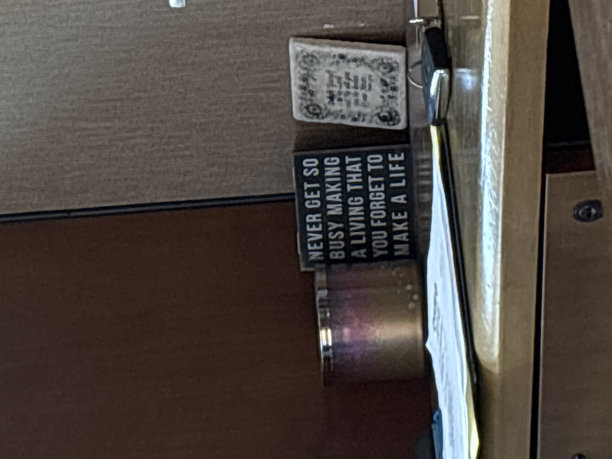 This image depicts an indoor setting, specifically a static arrangement of objects on a light-colored, possibly wooden, desk or counter surface, within the city of San Antonio, United States of America. No individuals are visible. In the foreground, a stack of white papers rests on a yellow sheet, positioned to the left of a dark-colored vehicle key fob featuring a silver metallic accent and a silver key ring. On the surface itself, from left to right, a cylindrical candle is contained within a metallic holder exhibiting a gradient finish that transitions from a gold/bronze hue at the base to a purplish tone at the top. Adjacent to the candle, a rectangular black sign with white sans-serif text is displayed, reading: "NEVER GET SO BUSY MAKING A LIVING THAT YOU FORGET TO MAKE A LIFE." To the right of the sign, a smaller, light-colored, rectangular plaque or tile, possibly ceramic or stone, features an embossed or carved design with ornate text and decorative borders, though the specific text is largely illegible. The background consists of two distinct vertical surfaces. The left surface is a solid, dark reddish-brown panel. The right surface is a lighter, textured brown panel, likely wood grain or laminate. A thin dark vertical line separates these two background elements. The scene is illuminated by ambient indoor lighting, indicating an interior environment.