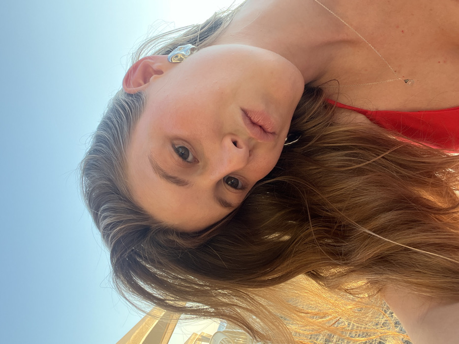 A fair-skinned woman tilts her head, framing her face against a bright blue sky. Light-brown hair cascades down, illuminated by sunlight. She wears a red top and a delicate silver necklace. Her left ear features a unique, silver sculptural earring. In the lower left corner, glimpses of a modern building add a touch of architectural context to the outdoor portrait.