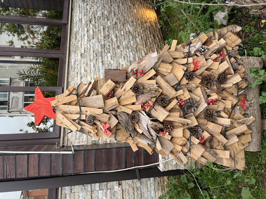 A rustic Christmas tree made of repurposed wood planks is positioned outdoors. A red star adorns the top. Pinecones and small red berry clusters serve as decorations, along with a string of lights. The tree leans against a building with a stone wall and dark wooden paneling. Green foliage surrounds the base.