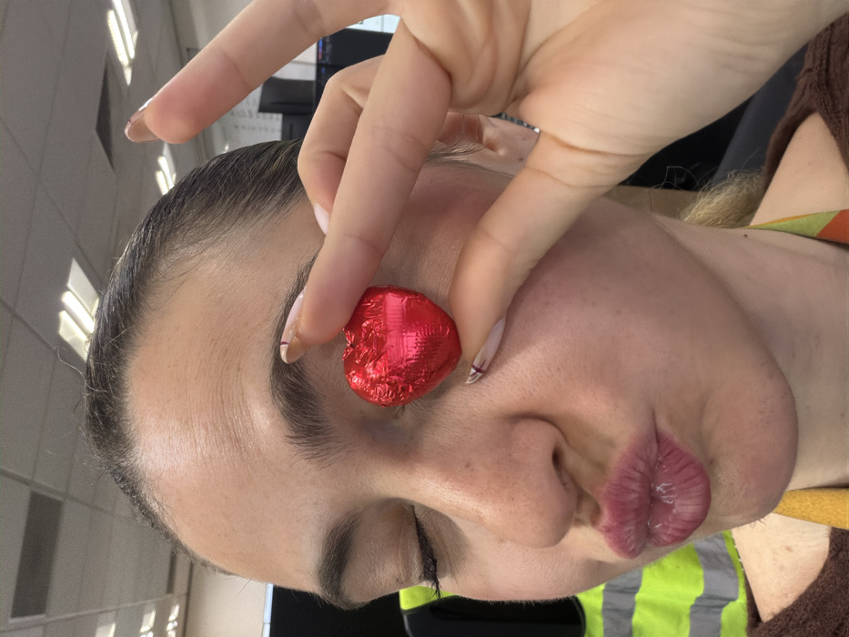 A close-up image depicts an adult female indoors, posing playfully. She has fair skin, dark hair pulled back, and her left eye is closed. Her lips are pursed in a "kissing" expression, accented by pink lip gloss. Her right hand, featuring manicured nails with light tips and a dark line design, holds a small, heart-shaped object wrapped in shiny red foil between her thumb and index finger, positioned directly over her right eye. She wears a brown textured garment and a patterned lanyard is visible around her neck. The background shows a white tiled ceiling with integrated lighting fixtures and hints of a professional environment, including a yellow-green high-visibility garment to the left and dark electronic screens or equipment faintly visible to the right. The scene is located in the city of Manchester, United Kingdom.