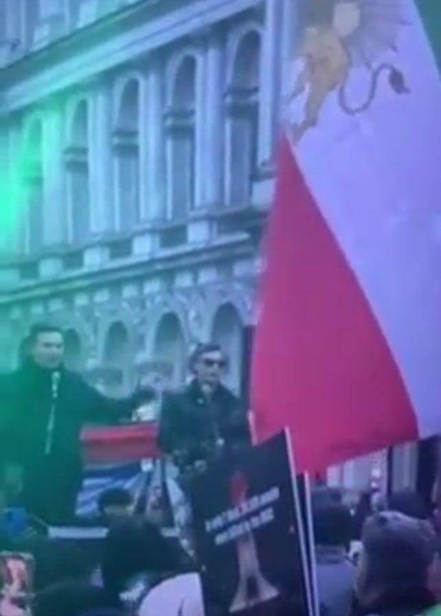 In a public outdoor space, likely a protest, a man speaks at a podium in front of a crowd. Another man stands beside him. Behind them is the old Iranian flag, featuring a lion with a sword on a white band. In the foreground, a person holds a sign with a picture of a man and text that reads "In only 2 years 31.540 people went back to the ARS." The building behind the crowd is a multi-story structure with arched windows. A green light is briefly visible. People in the crowd are holding phones.