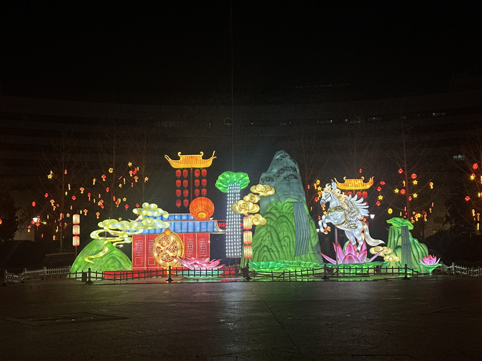 An extensive, illuminated lantern display is situated outdoors at night in Yiwu, China