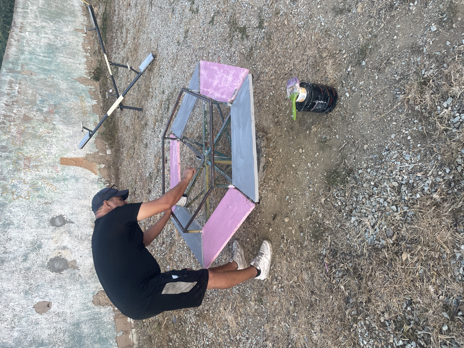 In the city of Altagracia, Venezuela, an adult male, wearing a black t-shirt, black and white athletic shorts, white sneakers, and a dark baseball cap, is depicted actively painting a hexagonal merry-go-round structure