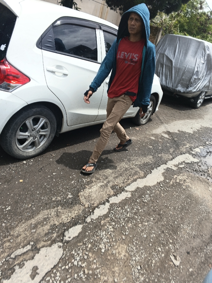 A man in a blue hoodie and red t-shirt walks on a cracked asphalt street next to a white car. He wears brown pants and black sandals. A silver-covered vehicle sits parked behind the car. The street shows signs of disrepair, with missing chunks and exposed aggregate. The man’s expression is neutral as he walks past the parked vehicles.