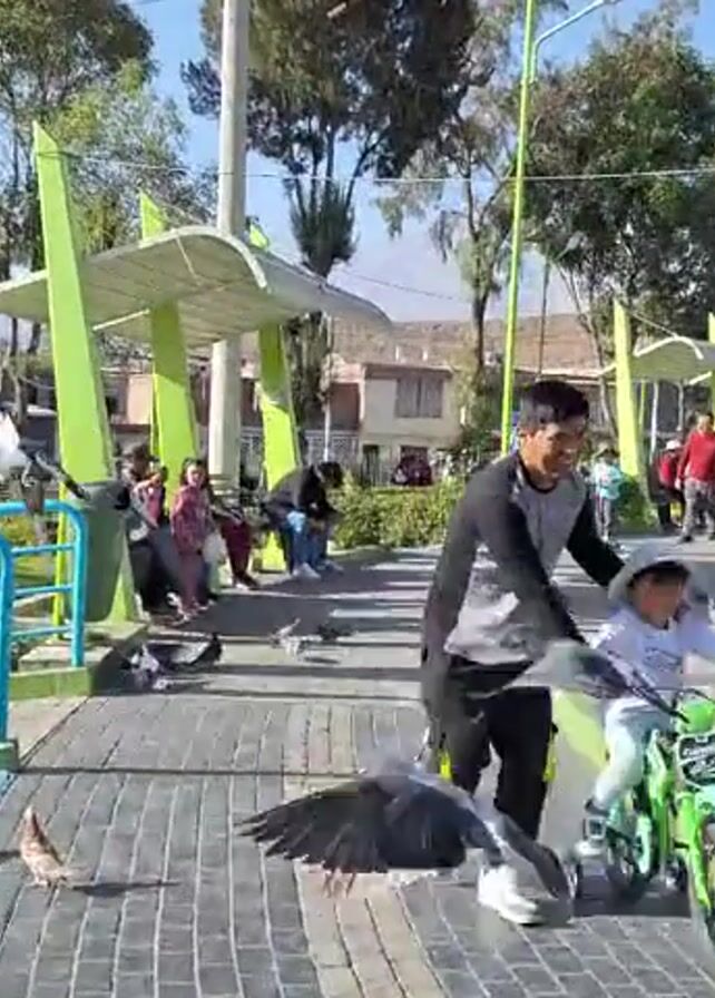 A man pushes a child on a small green bike through a public square. Pigeons are scattered across the paved ground, some flying away as they approach. Other people are visible in the background, sitting on benches or walking. The square features modern green and white shelters, light posts, and some decorative elements. The buildings and sky are visible in the background under bright sunlight.