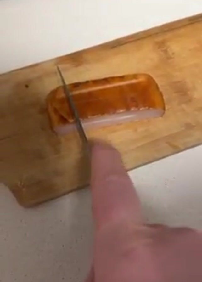 A person uses a stainless steel knife to cut a rectangular piece of cooked sausage, bockwurst, or similar cured meat on a wooden cutting board